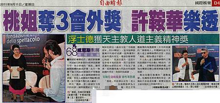 2011.09.11 自由時報 - 《桃姐》奪3會外獎 許鞍華樂透