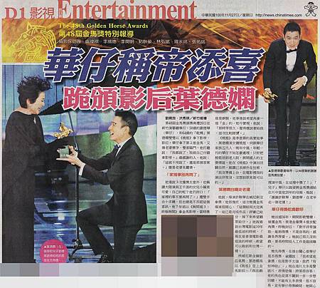 2011.11.27 中國時報 - 華仔稱帝添喜 跪頒影后葉德嫻