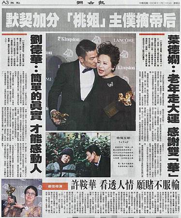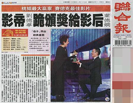 2011.11.27 聯合報 - 《桃姐》最大贏家 影帝劉德華跪頒獎給影后葉德嫻