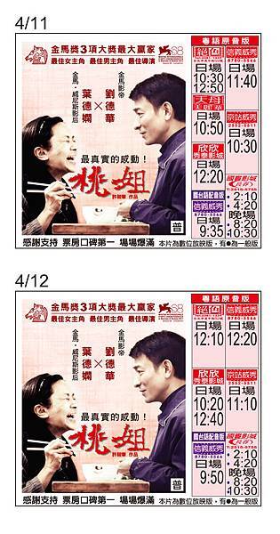 《桃姐》台北區0411-0412上映時刻表,其他地區請上Yahoo、MSN娛樂或各大影城查詢。 場次若有調整,以戲院公告為主喔!