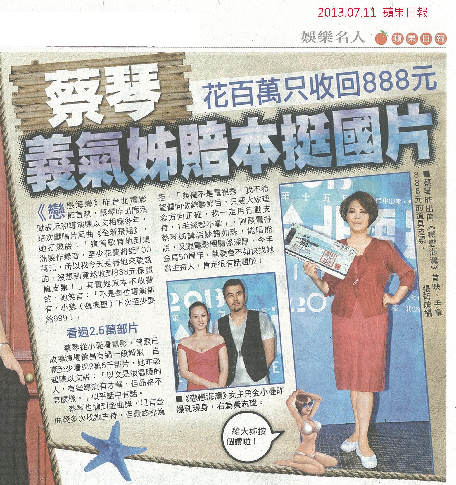 《戀戀海灣》昨台北電影節首映,蔡琴昨出席活動表示和導演陳以文相識多年,這次獻唱片尾曲《全新飛翔》,她打趣說:「這首歌特地到澳洲製作錄音,至少花費將近100萬元,所以我今天是特地來要錢的,沒想到竟然收到888元保麗龍支票!」其實她原本不收費的,她笑言:「不是每位導演都有,小魏(魏德聖)下次至少要給999!」