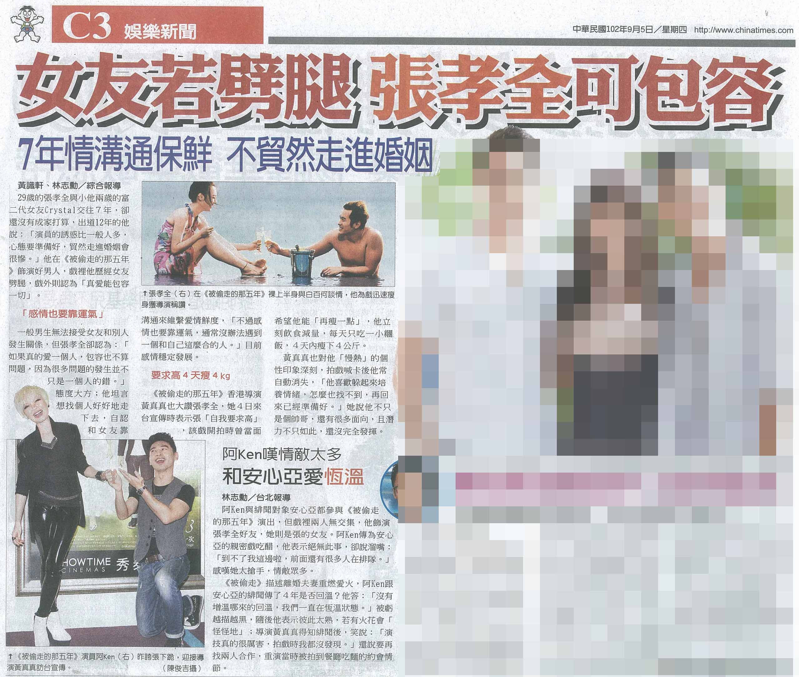 29歲的張孝全與小他兩歲的富二代女友Crystal交往7年,卻還沒有成家打算,出道12年的他說:「演員的誘惑比一般人多,心態要準備好,貿然走進婚姻會很慘。」他在《被偷走的那五年》飾演好男人,戲裡他歷經女友劈腿,戲外則認為「真愛能包容一切」。