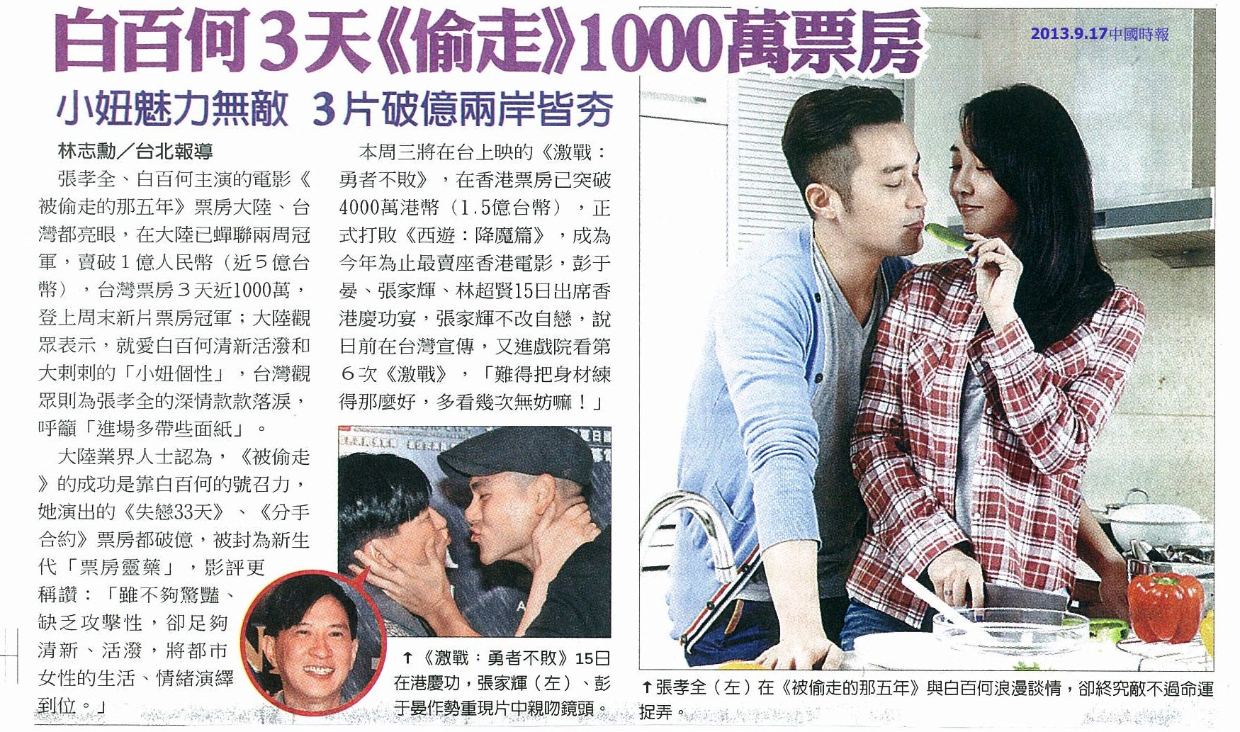 張孝全、白百何主演的電影《被偷走的那五年》票房大陸、台灣都亮眼,在大陸已蟬聯兩周冠軍,賣破1億人民幣(近5億台幣),台灣票房3天近1000萬,登上周末新片票房冠軍;大陸觀眾表示,就愛白百何清新活潑和大剌剌的「小妞個性」,台灣觀眾則為張孝全的深情款款落淚,呼籲「進場多帶些面紙」。