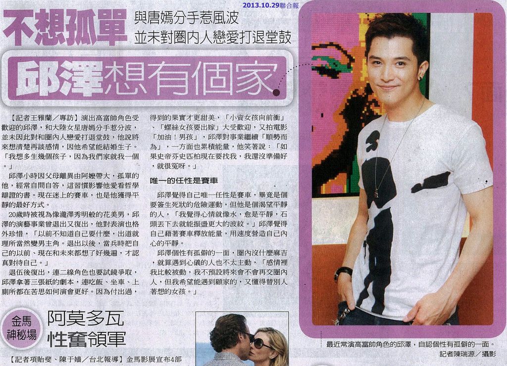演出高富帥角色受歡迎的邱澤,和大陸女星唐嫣分手惹分波,並未因此對和圈內人戀愛打退堂鼓,他說將來想清楚再談感情,因他希望能結婚生子。「我想多生幾個孩子,因為我們家就我一個。」